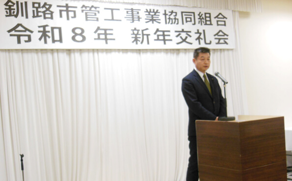令和8年1月16日(金)、アクア・ベールくしろにて、釧路市管工事業協同組合及び各企業の発展と工事の安全祈願の神事を執り行いました。終了後には新年交礼会を開催し、来賓、組合員、賛助会員の計58名が出席し盛況のうちに終了しました。