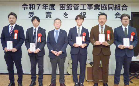 受賞されましたのは、函館市技能功労者表彰に ㈲菊池設備 菊池洋一さん、北海道中小企業団体中央会会長表彰に ㈱キムラ住設 木村謙一さん・㈱高丘設備工業髙橋眞司さん・㈱三益工業 神山寿信さん、渡島地方技能尊重運動推進協議会優秀技能者