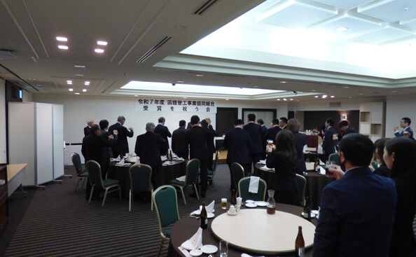令和7年12月9日(火)、プレミアホテル CABIN PRESIDENT 函館にて、受賞を祝う会が開催され、組合員・事務局職員あわせて35名が出席しました。
