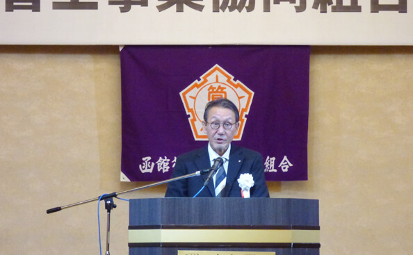 令和7年5月16日(金)、「ホテル函館ロイヤルシーサイド」にて令和7年度第45回通常総会が開催され、議案の審議を行い原案通り承認されました。その後、組合功労者・永年勤続者表彰式を行い、村田理事長から表彰状と記念品が贈呈されました。
