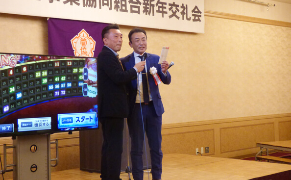 令和8年1月21日(水)、「花びしホテル」にて新年交礼会が開催されました。来賓・組合員・函館管栄協力会合わせて68名が参加し、村田理事長の挨拶のあと、函館市長はじめ来賓の方々からご祝辞を頂きました。その後、手塚企業局長のご発声で祝宴に入りました。余興は、ポップスピアニストの「しおメロディー」さんによるピアノ演奏とビンゴ大会で、和やかな雰囲気の中祝宴が進みました。