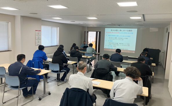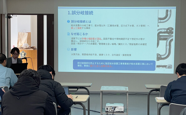 令和8年2月25日、組合会館において給水装置工事主任技術者13名を対象とした研修会を開催しました。本研修会は、水道法改正により指定給水装置工事事業者の更新制度が導入されたことを踏まえ、主任技術者の制度理解および技術向上を目的として実施しました。