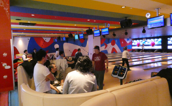 はじめに、「ギーゴボウルノルベサ」において、20名が7チームに分かれボウリングを2ゲーム行い、個人戦、団体戦の2種目で競い合いました。